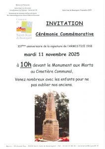 Commémoration du 11 nov Cérémonie le mardi 11 novembre 2025 à 10h au Monument aux Morts dans le cimetière communal.